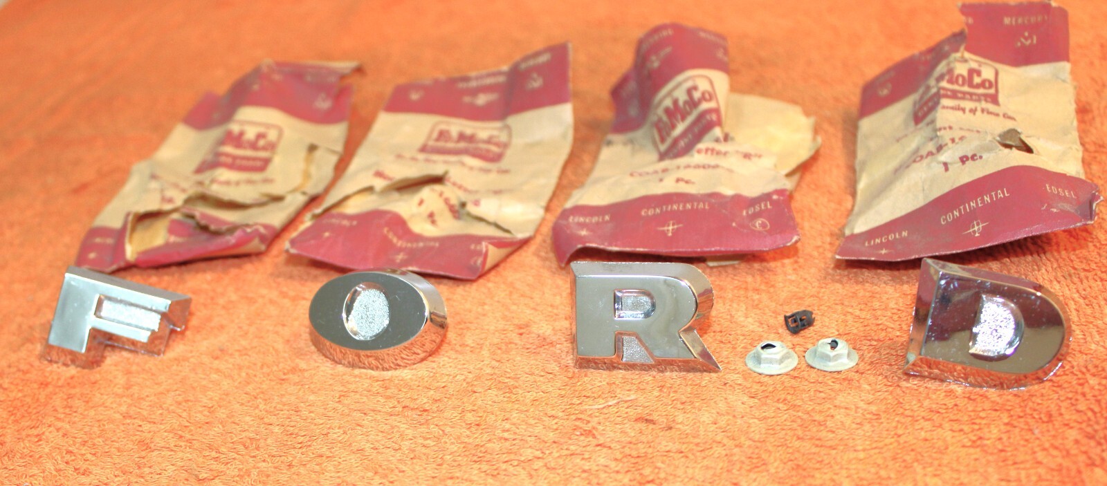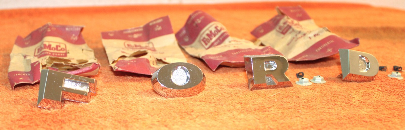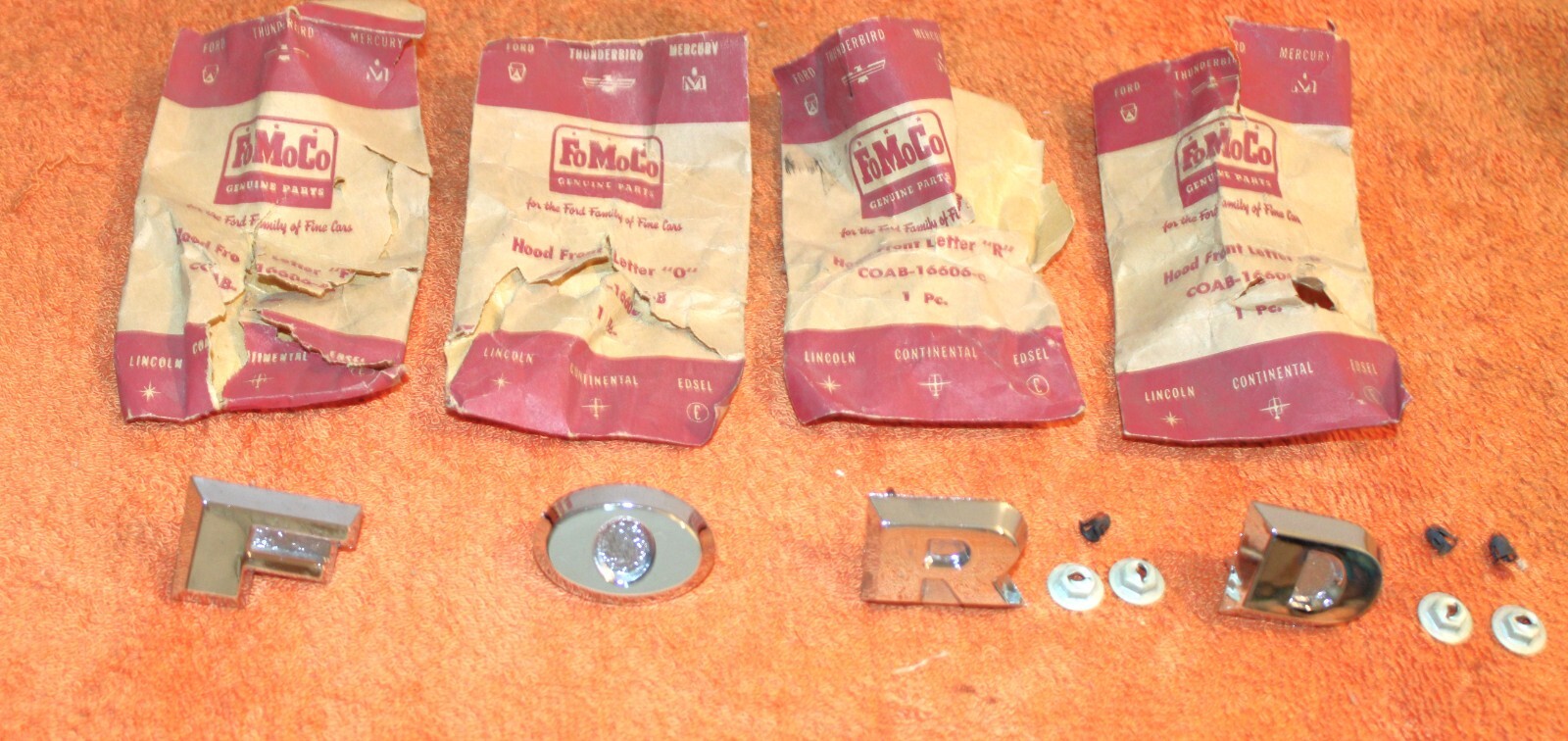 NEW OLD STOCK HOOD or TAILGATE ‘F-O-R-D’ EMBLEM LETTERS. These are ORIGINAL FORD NOS PARTS. Brand New in the packages. The chrome is excellent and these all look really nice. Excellent Condition. IMPOSSIBLE TO FIND NOS. Please email with questions. 030124-5 WE HAVE AN EBAY STORE WITH THOUSANDS OF ORIGINAL and NOS FORD PARTS. CHECK IT OUT.