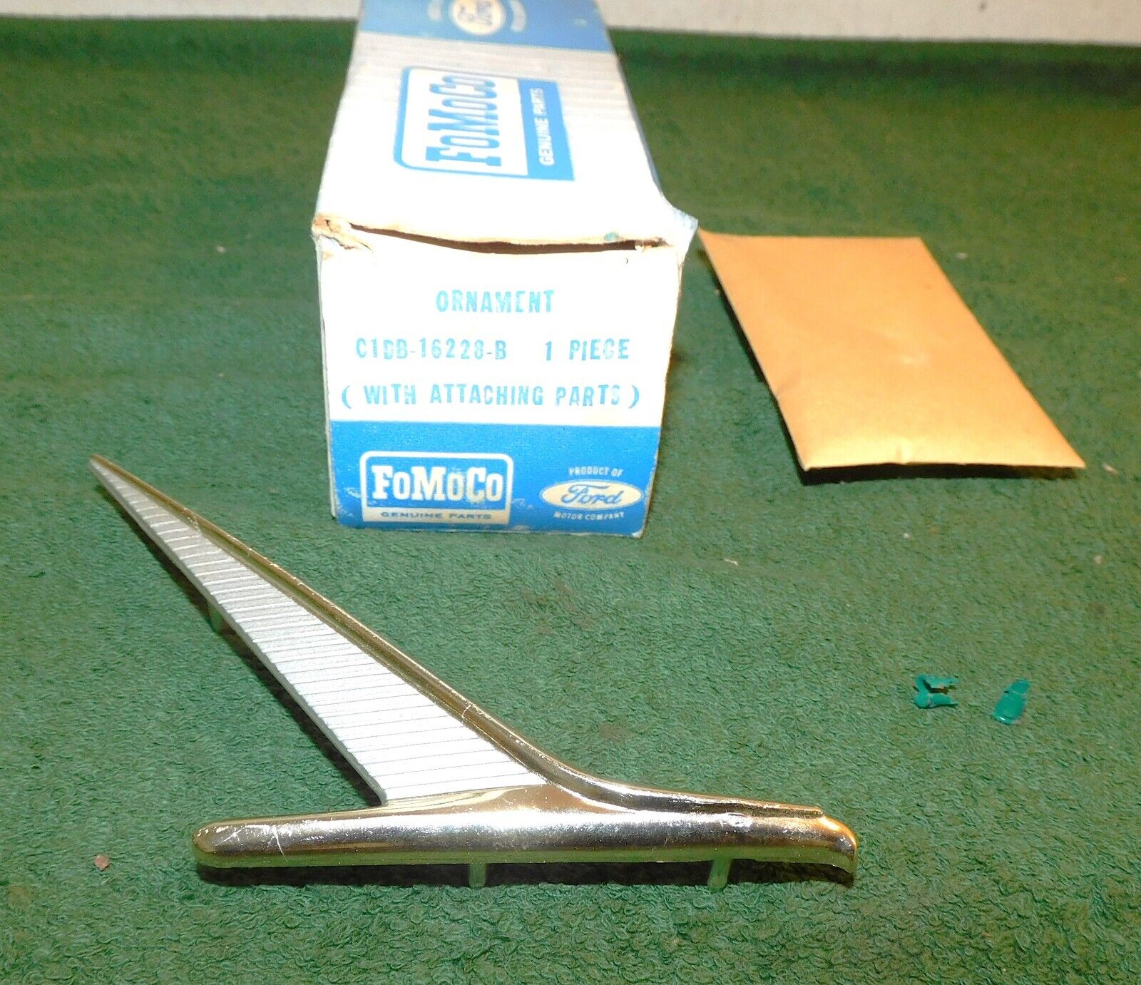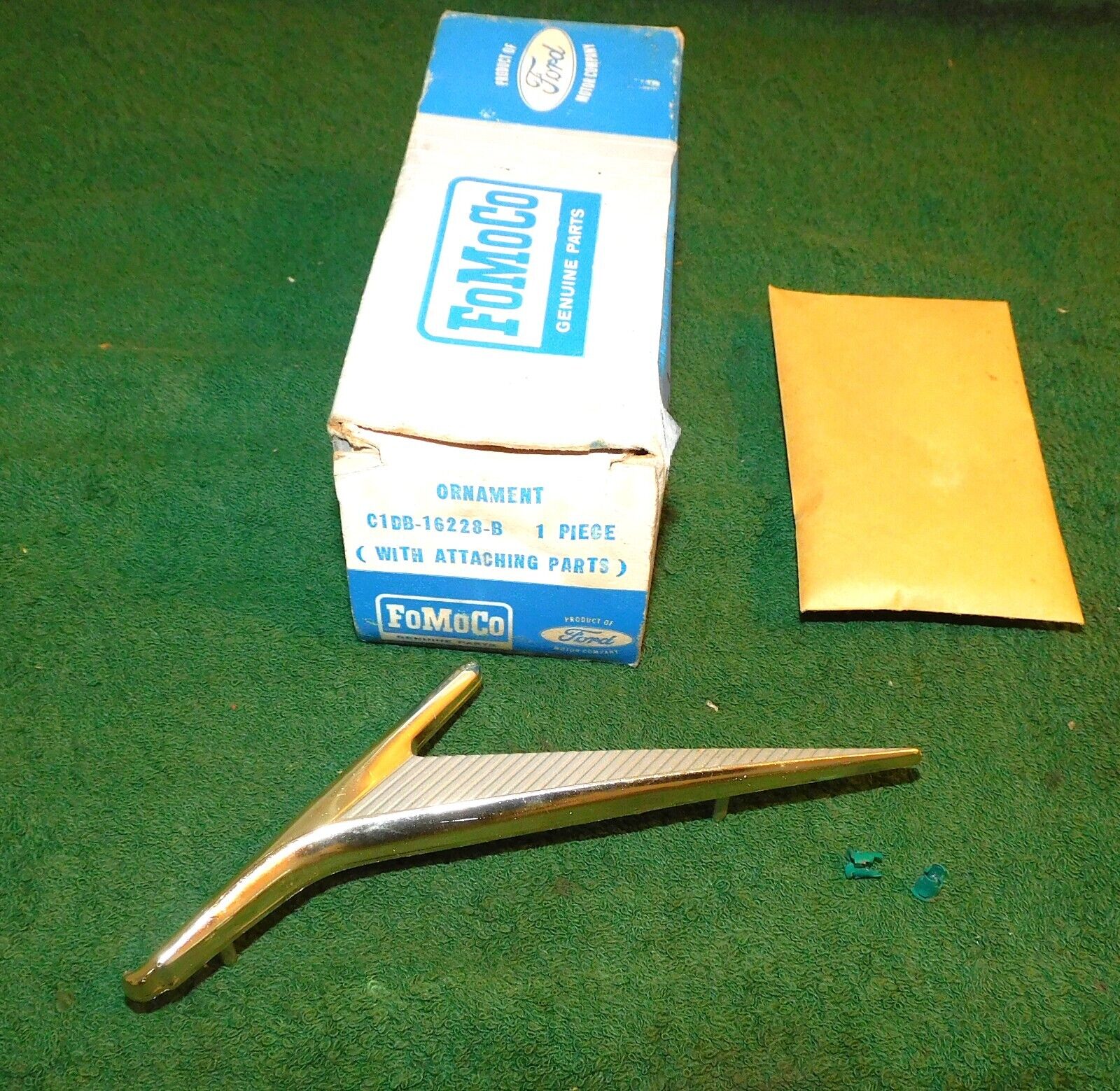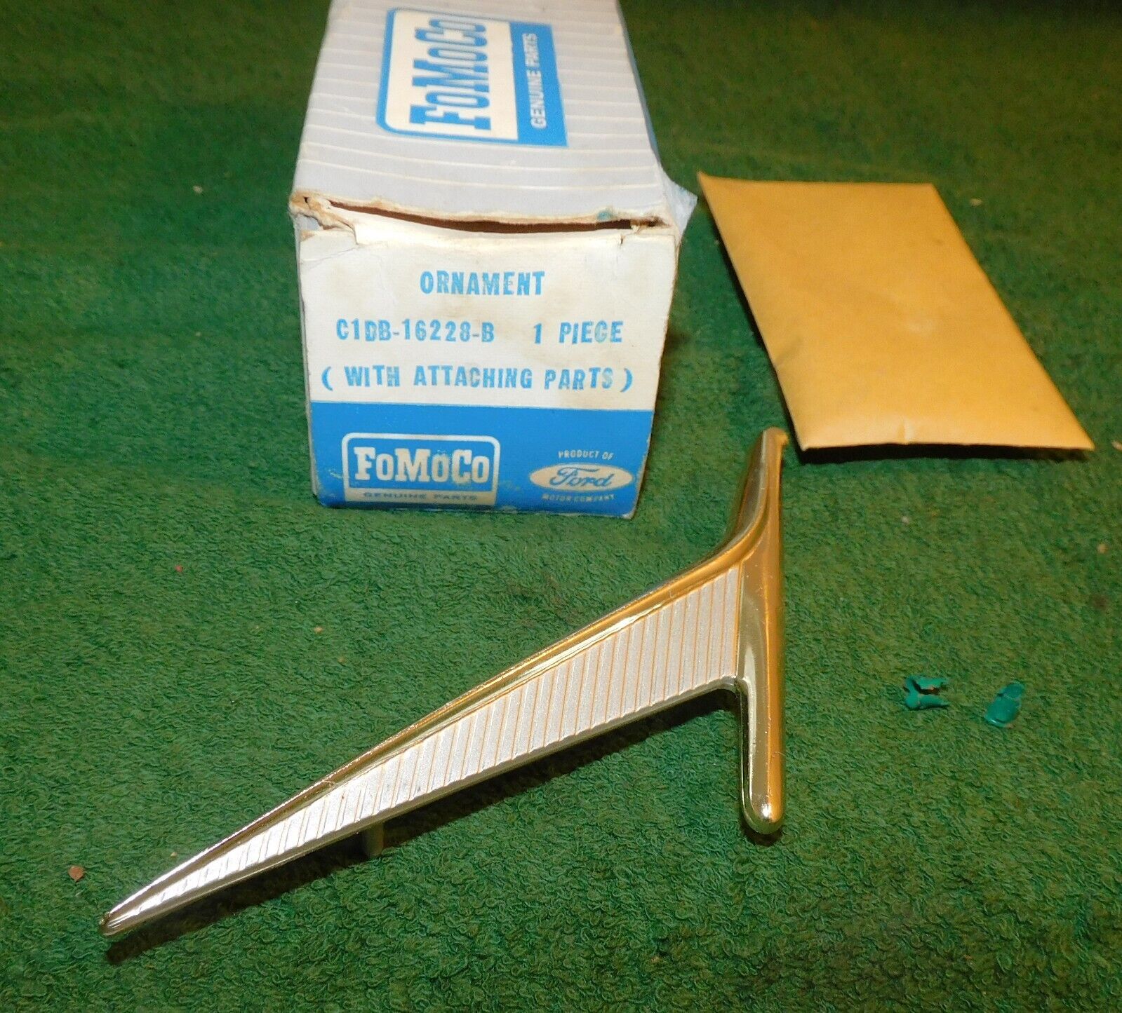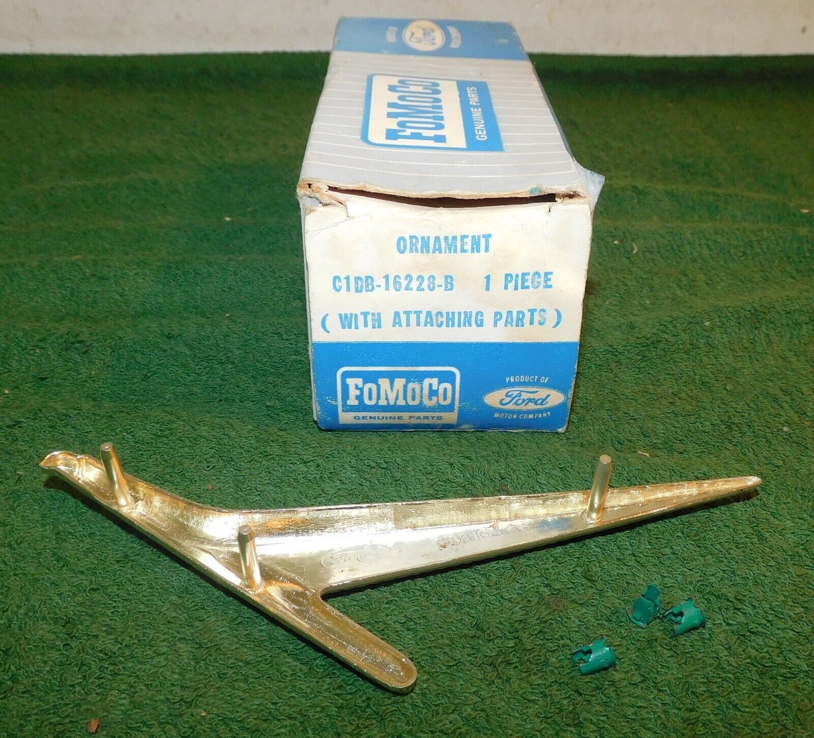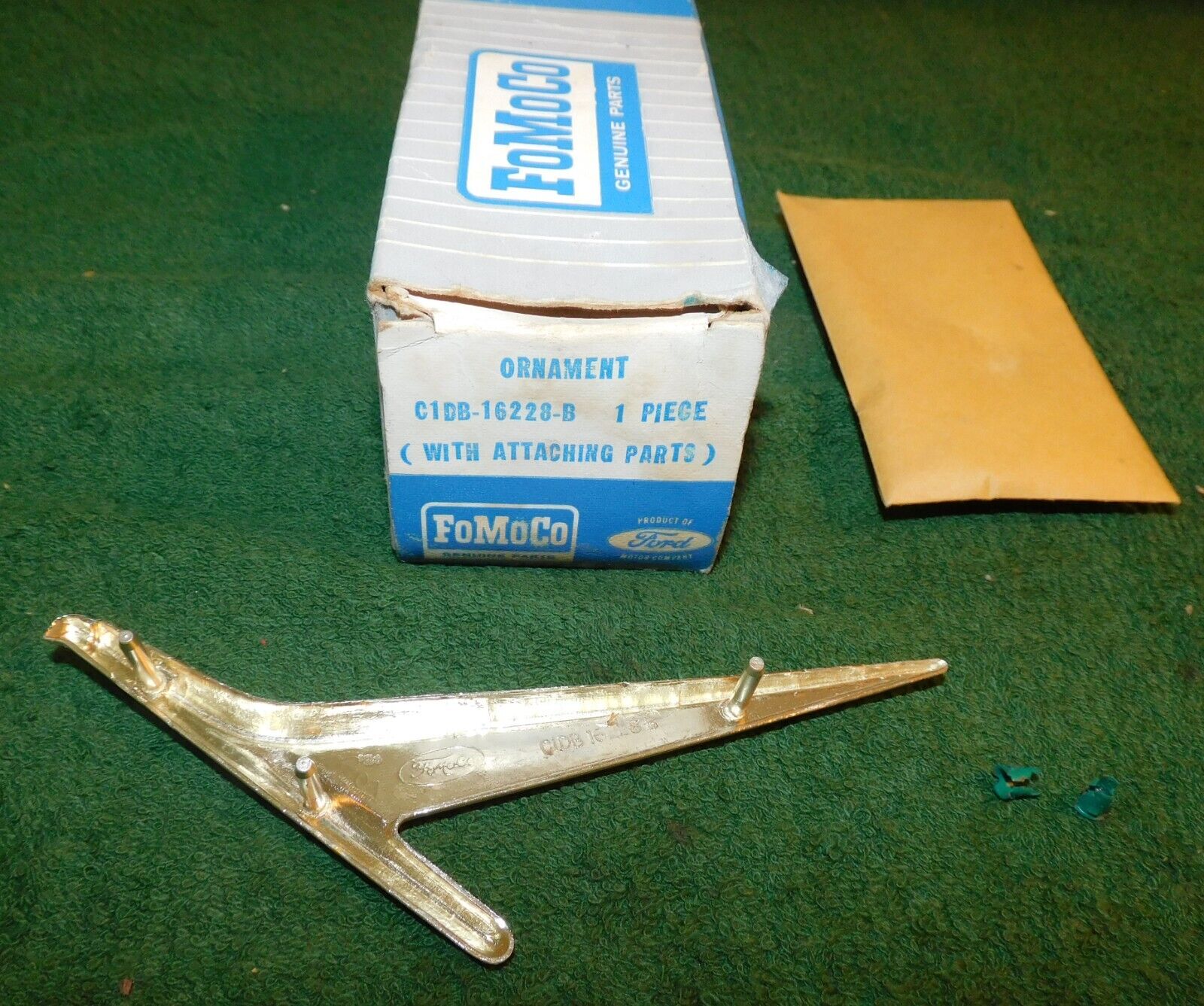 1961 Ford Falcon, 2-Door, 4-Door, Station Wagon, Deluxe, Futura. (1) NEW OLD STOCK Passengers RH Right Side FRONT FENDER EMBLEM ORNAMENT. This is an ORIGINAL FORD NOS PART. Brand New in the box. Excellent Condition. Nice looking gold finish with just minor scratching which is typical even when new in the box. Impossible To Find NOS. Please email with questions. 040323-12 WE HAVE AN EBAY STORE WITH THOUSANDS OF ORIGINAL and NOS FORD PARTS. CHECK IT OUT.