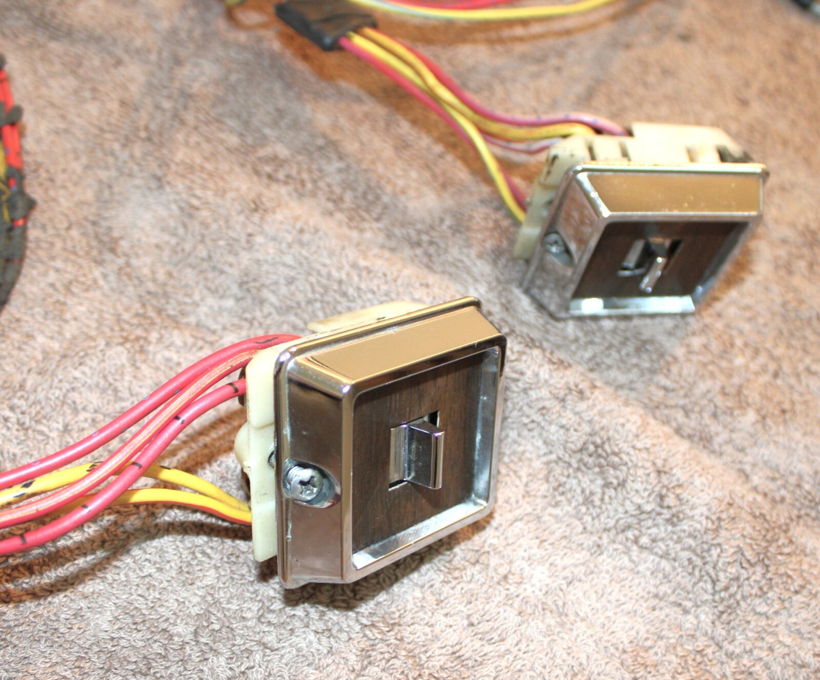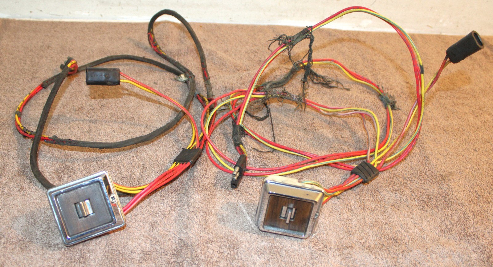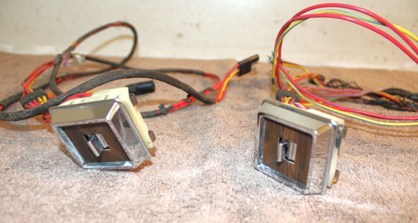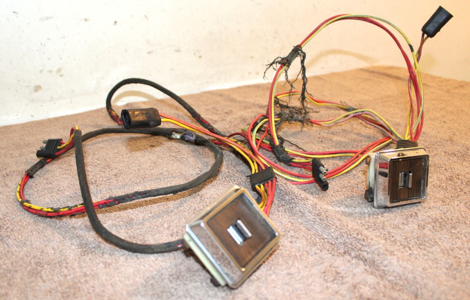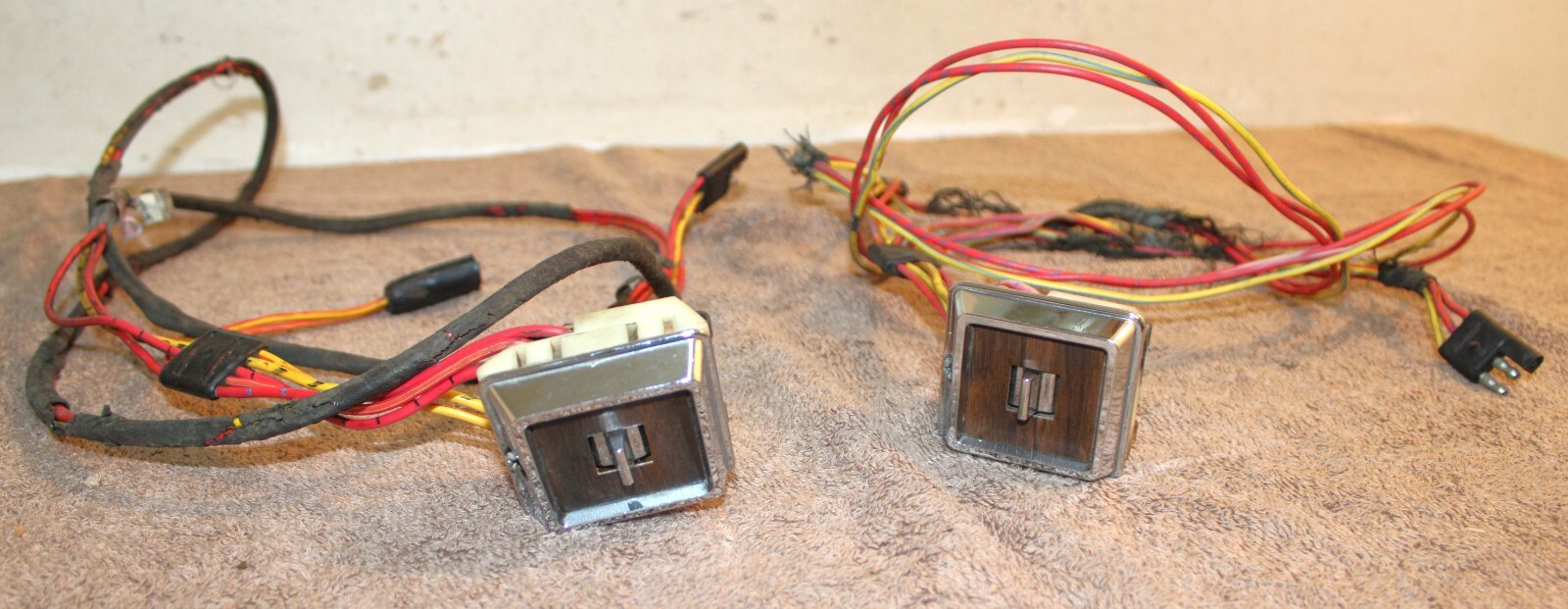 1973 Ford Mustang, Fastback, Coupe, Convertible, Grande, Mach 1, Mercury Cougar, Hardtop, Convertible, XR7. LH&RH POWER QUARTER WINDOW CONTROL SWITCHES, BEZELS And WIRING HARNESSES. These are ORIGINAL FORD PARTS. Removed from a 73 Mustang Mach 1 with Power Windows. These are in Excellent Condition. The wiring looks great. Nice color. No cuts or splices. Great plugs. The bezels look excellent with very bright chrome and great woodgrain. No pitting or rust. The switches do work. No guarantees how long they will work. No cracks or splits. Impossible To Find Original. Please email with questions. 031425-11 WE HAVE A STORE WITH THOUSANDS OF ORIGINAL and NOS FORD PARTS. CHECK IT OUT.